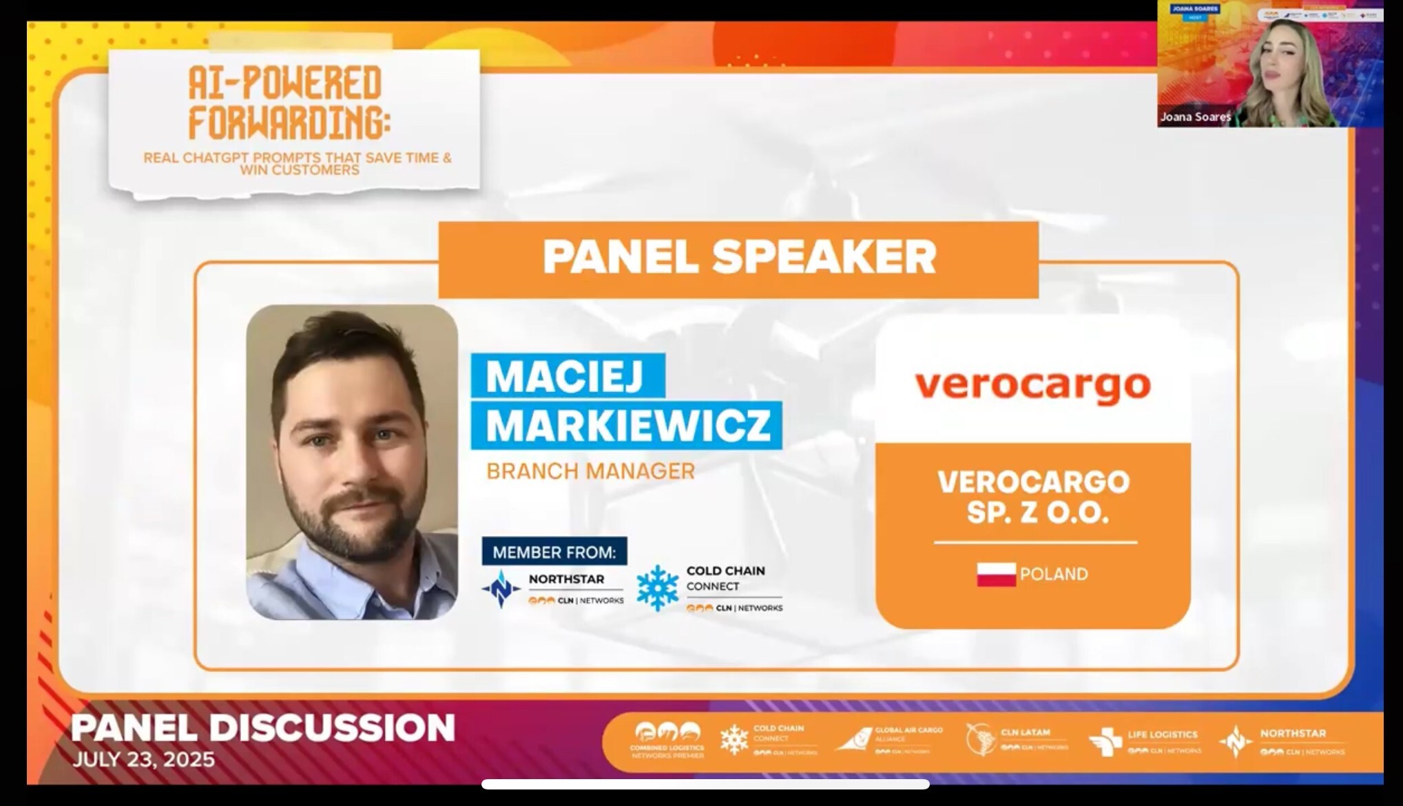 23.07.2025 r. w ramach CLN Premier - Independent Global Freight Forwarders Partnership odbył się panel dyskusyjny: „AI-Powered Forwarding: Real ChatGPT Prompts That Save Time and Win Customers”, czyli jak realnie wykorzystywać sztuczną inteligencję w codziennej pracy spedytora. Wśród czwórki prelegentów z Indii, Nigerii i ZEA znalazł się, jako jedyny reprezentant Europy, Maciej Markiewicz - kierownik naszego oddziału w Gdyni. Maciej znakomicie zaprezentował verocargo, a także sieci Cold Chain Connect i Northstar Forwarders Alliance, do których dołączyliśmy w lipcu tego roku.